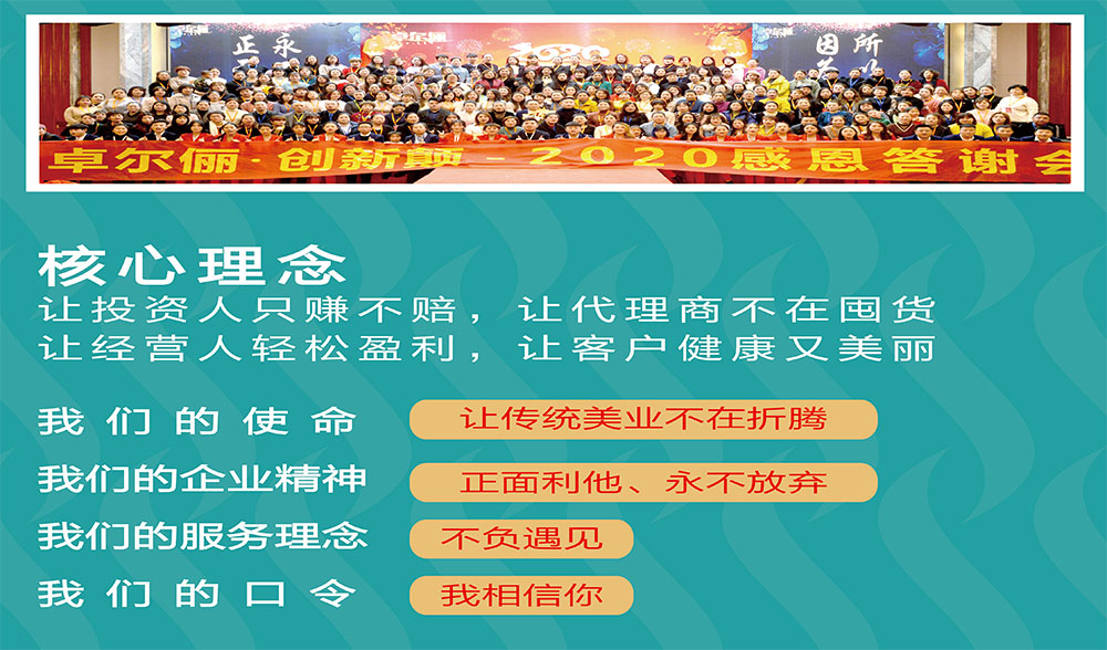 卓爾儷創(chuàng)于2006年,迄今己屹立業(yè)界13年,卓爾儷長(zhǎng)期以來秉持“愛與美”的文化,以“奉獻(xiàn)美麗與健康”為經(jīng)營(yíng)宗旨,以“品質(zhì)為本,創(chuàng)新為魂”為經(jīng)營(yíng)理念,將連鎖體系中所有成員定位于戰(zhàn)略伙伴式的合作關(guān)系,倡導(dǎo)企業(yè)、加盟店、消費(fèi)者“三贏”的陽(yáng)光工程。為此,設(shè)立了專門的售后服務(wù)中心,將在產(chǎn)品、形象、研發(fā)、營(yíng)銷、管理等各個(gè)環(huán)節(jié)全面提升品牌競(jìng)爭(zhēng)力。
